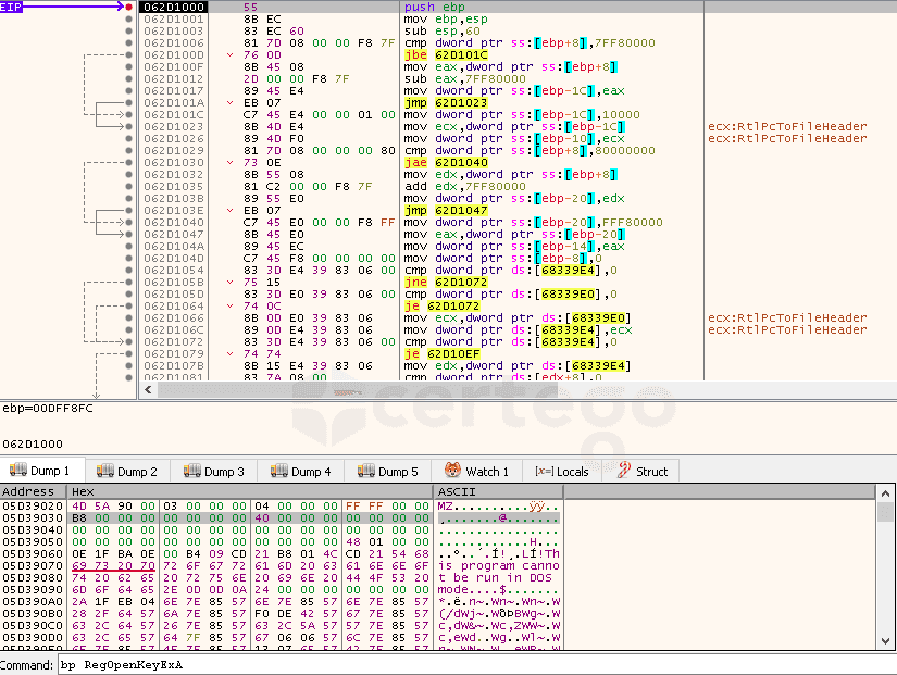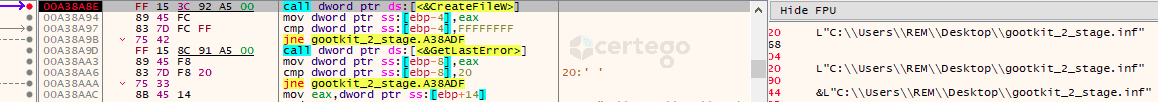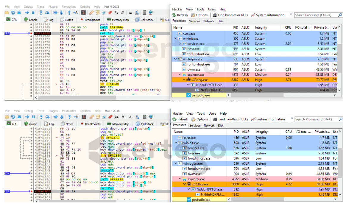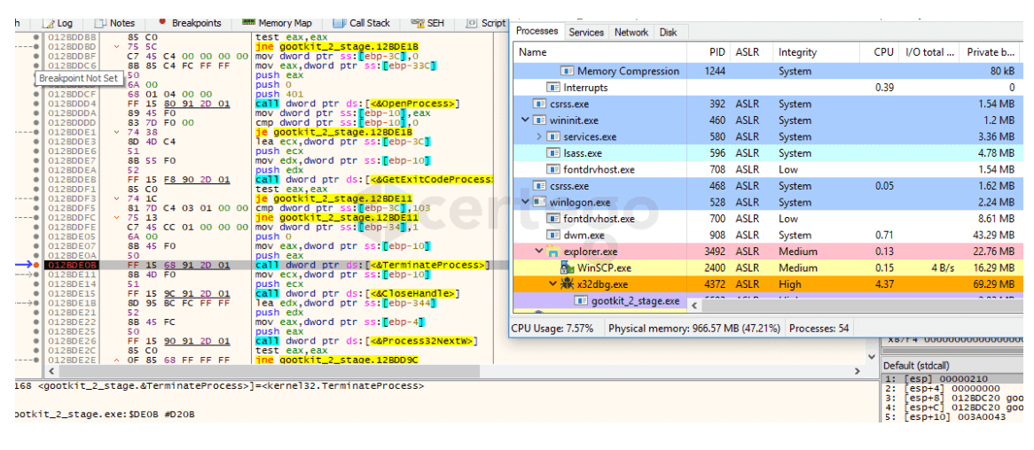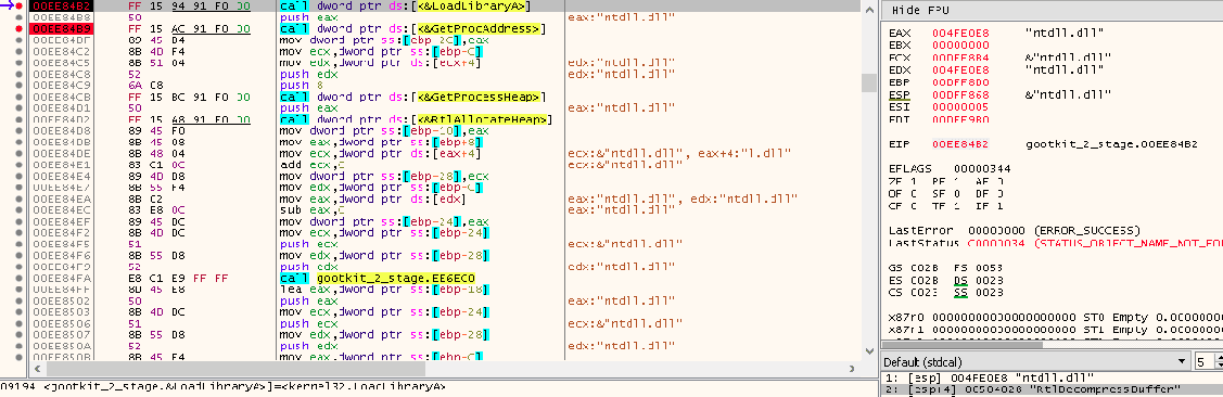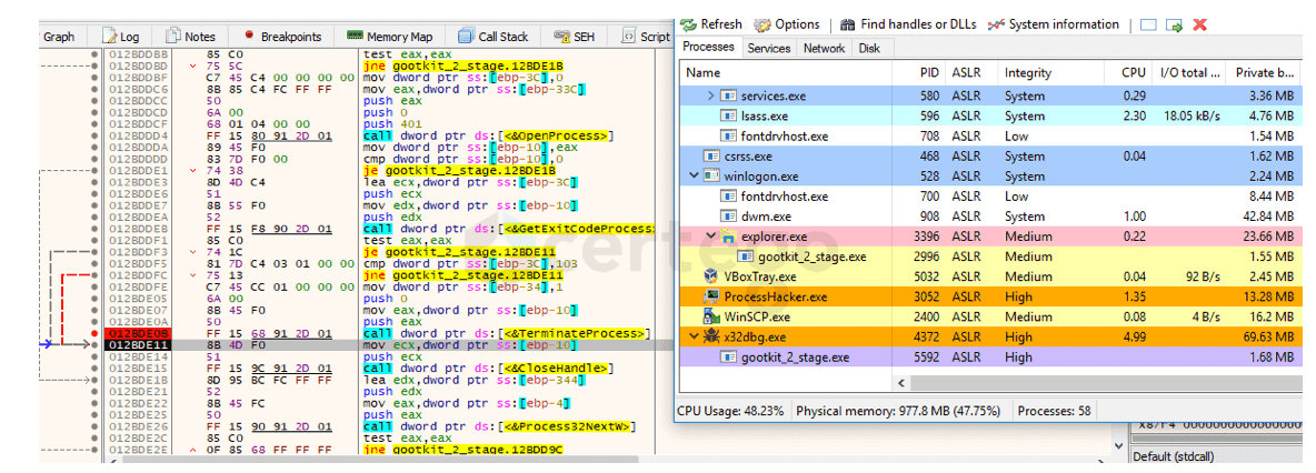 Also, Gootkit takes advantage of The Heaven’s Gate as an anti-debugging technique because the majority of commonly used debuggers can’t properly handle this situation, not allowing the analyst to follow the code of the Gate step-by-step.