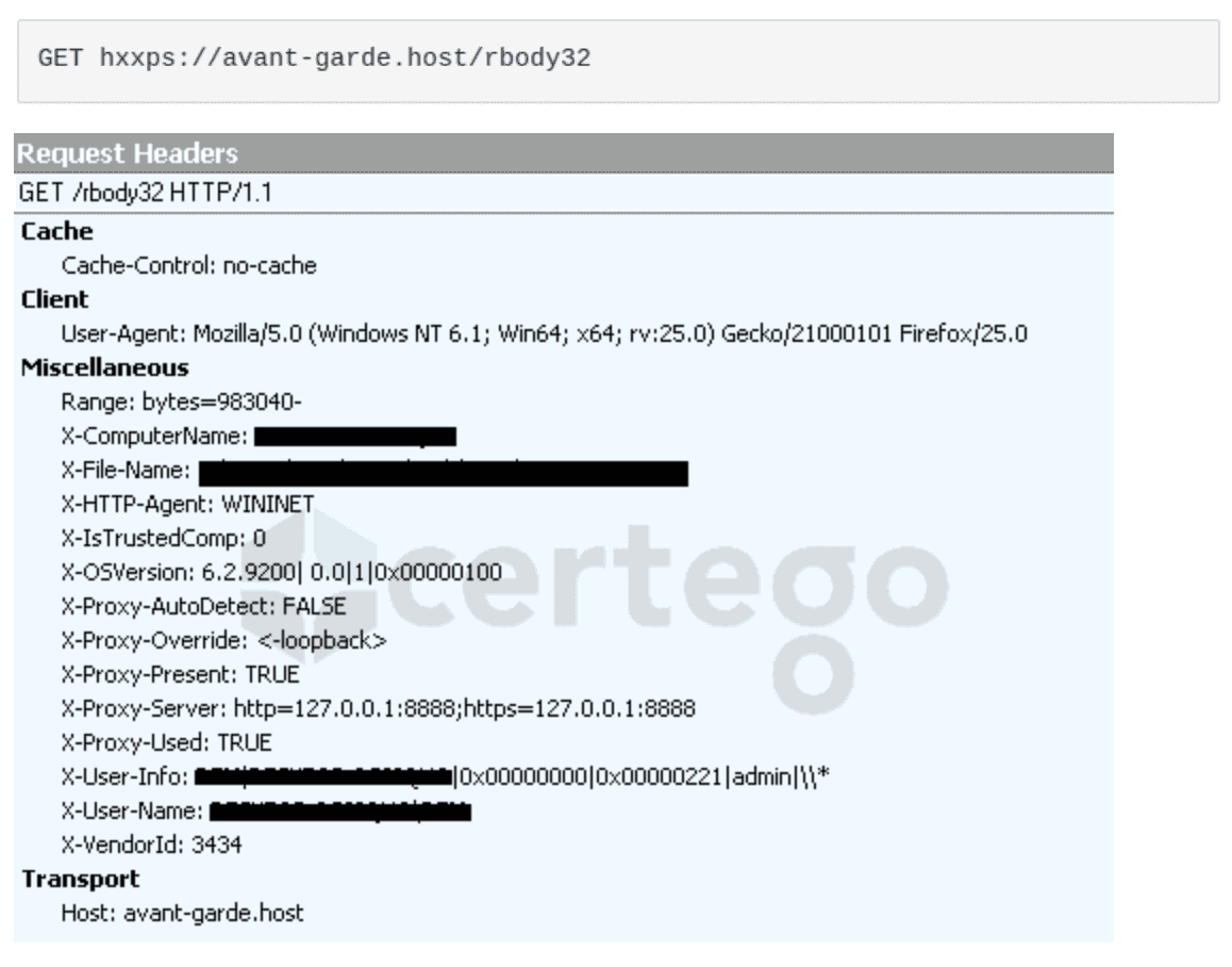 As we can see from the image, many headers were added to the request to send different informations of the infected machine to the C&C Server.