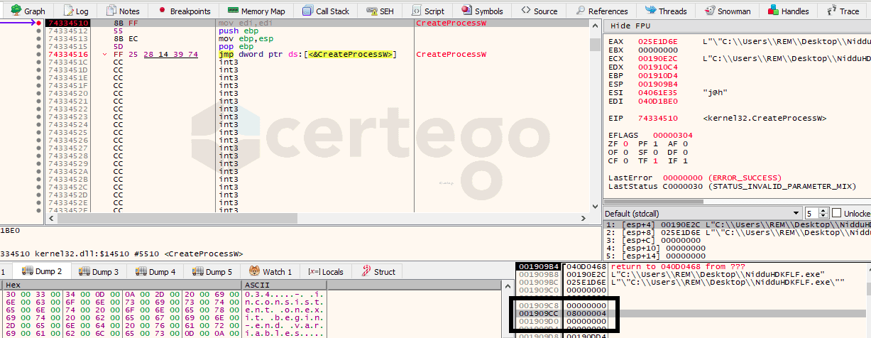 In the image we can see that the 6th parameter of "CreateProcessW" was set to "4", indicating that the process will start in a suspended state.