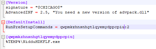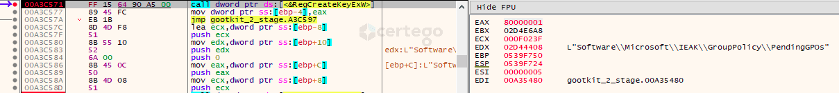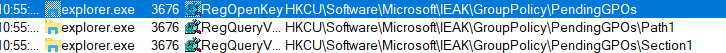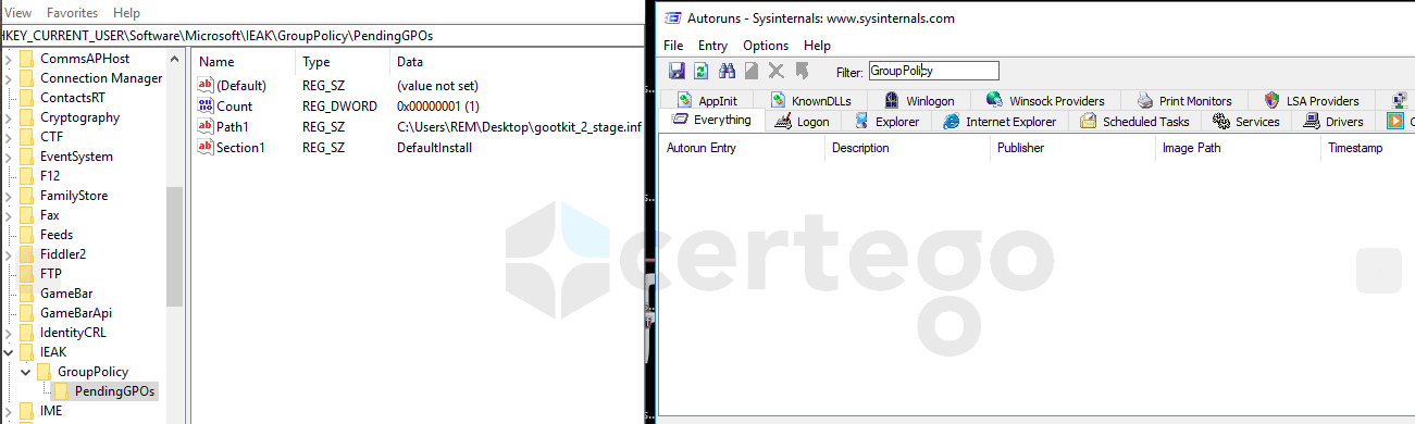 Then it creates 3 different registry keys (“Count”, “Path1” and “Section1”) inside “HKCU\Software\Microsoft\IEAK\GroupPolicy\PendingGPOs” with the purpose to allow the threat to execute on reboot.