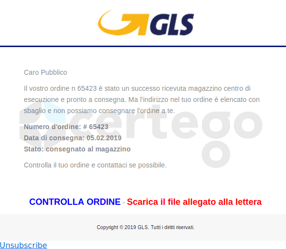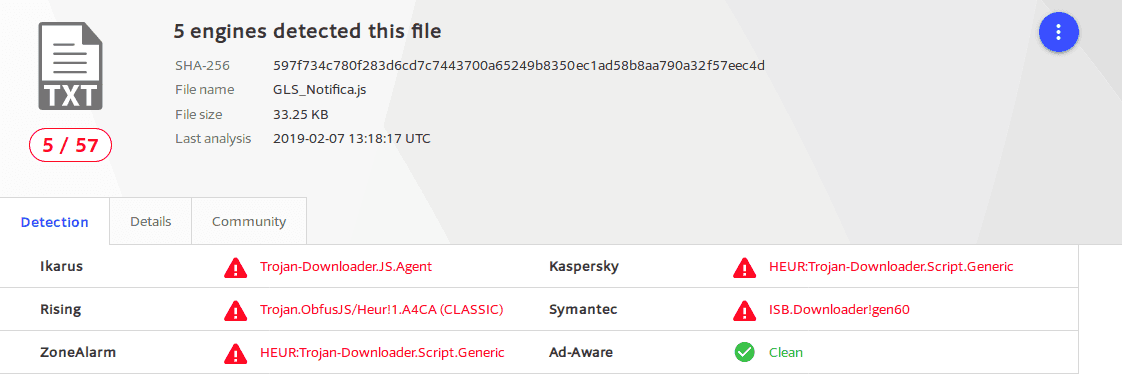 The downloaded file is a heavily obfuscated Javascript file called "GLS_Notifica.js". If the user opens it, the native Javascript interpreter wscript.exe would be executed by default and it would perform the following HTTP request: