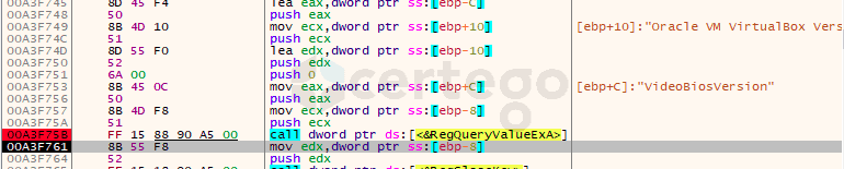 - it checks if “HKLM\HARDWARE\Description\System\VideoBiosVersion” contains the word “VirtualBox”