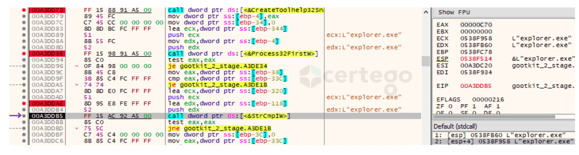 Then, it iterated through the retrieved list via “ Process32FirstW” and “Process32NextW” with the aim to get a handle to the active “explorer.exe” instance.