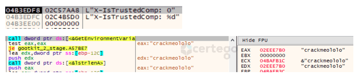 In particular one of the headers caught my attention: “ X-IsTrustedComp”. Digging into the code we found that the value would be set to “1” if an environment variable called “crackmeololo” was found in the host, “0” otherwise.