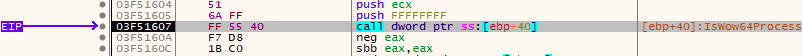 After some shellcode injections inside its memory space, the process executes a call to IsWow64Process API that is used by the application to understand if the process is running under the WOW64 environment (Wiki) : this is a subsystem of the Windows OS that is able to run 32-bit applications, like this one, on 64-bit operating systems.