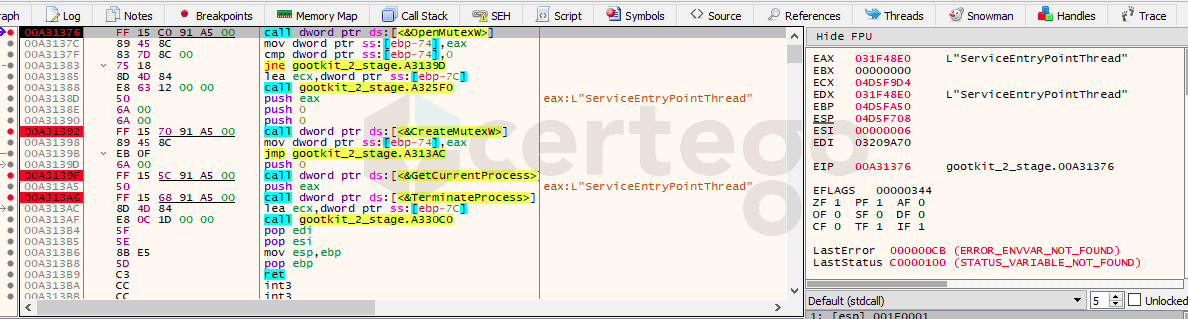 The very first considerable finding was the check for the existence of a mutex object named “ServiceEntryPointThread”. If it exists, the process would terminate itself.