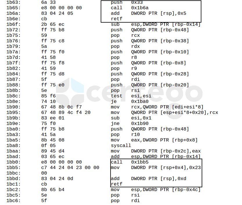 Practically, thanks to the RETF instruction, it’s possible to change the code segment (CS) from 0x23 to 0x33, de facto enabling 64-bit mode on the running process.