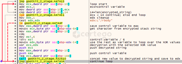 Stepping through the code, we noticed that, at runtime, Gootkit decrypts the strings it uses with a custom algorithm to evade static analysis detection of anomalous behaviour.