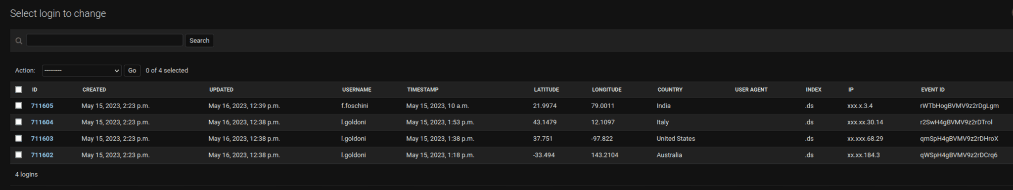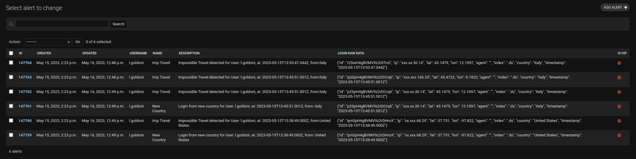 • Login from a new country: this alarm is dispatched if the system is logged by a user from a country where they have never authenticated before.