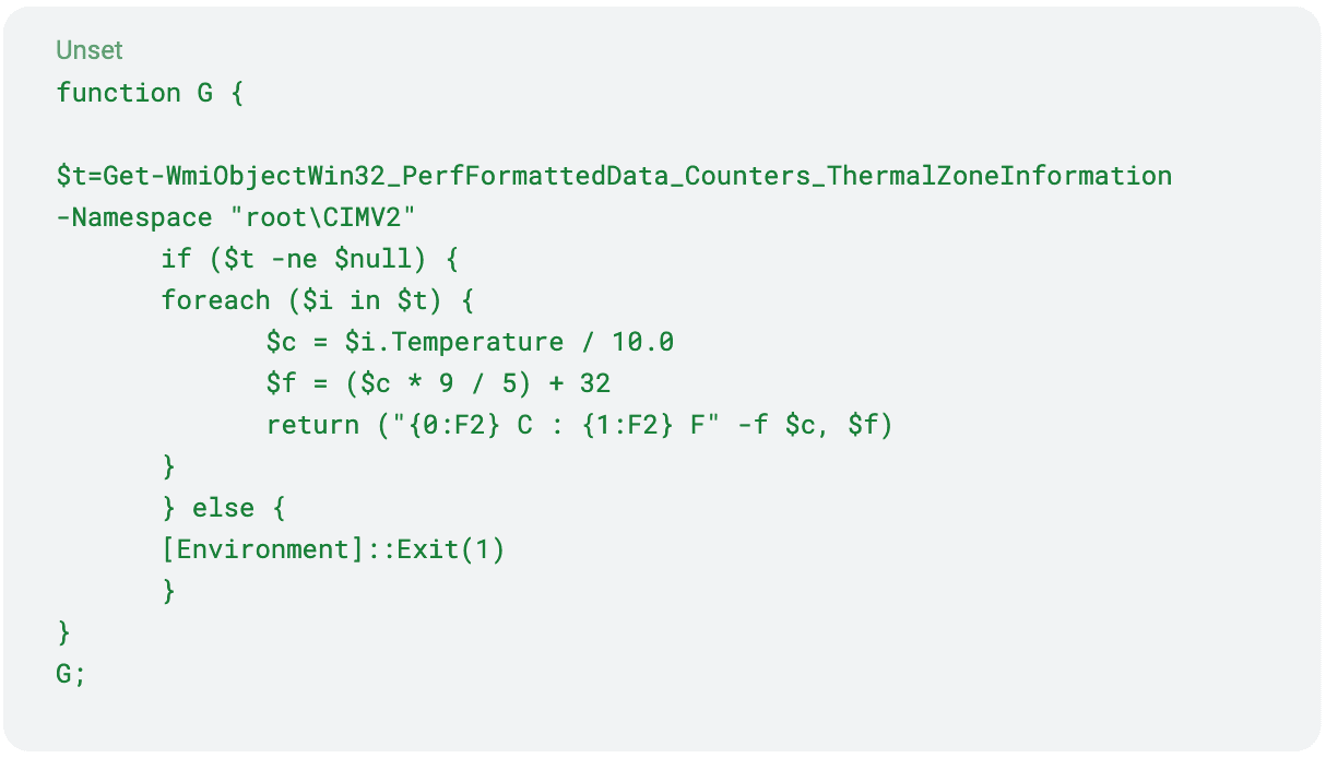 • La prima funzione (function G) agisce da "virtual machine evasion": lo script verifica se è in esecuzione su una macchina virtuale o su una macchina fisica. Per determinare se si trova all'interno di una macchina fisica, vengono controllati i sensori di temperatura, che non sono presenti in una macchina virtuale. Se la verifica fallisce, lo script si chiude senza compiere alcuna azione.