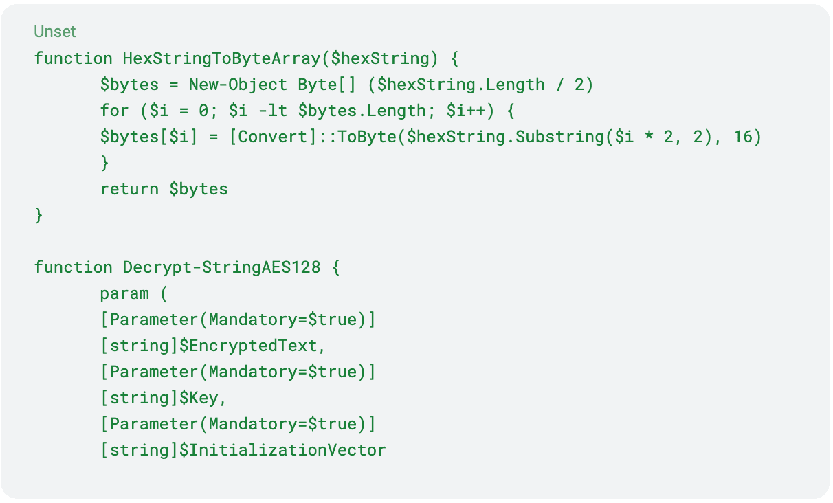 Successivamente all’esecuzione, viene scaricato un secondo script PowerShell. Il suo codice offuscato è costituito da varie funzioni; di seguito elencate: