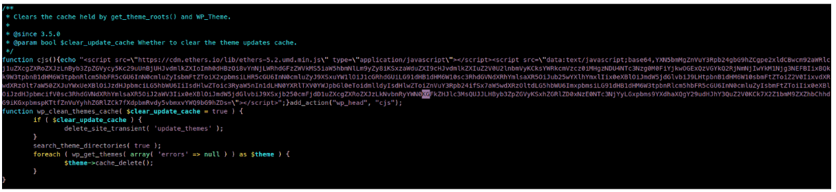 Una ricerca del codice Javascript offuscato, all’interno dei vari file della web app, ci ha consentito di scoprire che tale codice è stato iniettato all'interno del file “/site/wwwroot/wp-includes/theme.php”.