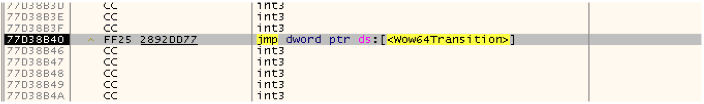 The execution of the binary in a debugger detected a code injection technique called “Heaven’s gate”.