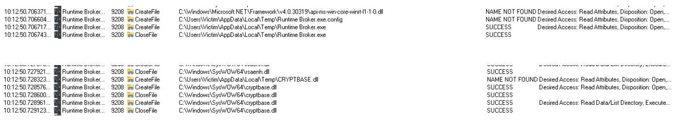 This is the list of files the binary modifies or looks for, it seems it is searching for a config file called “Runtime Broker.exe.config”.