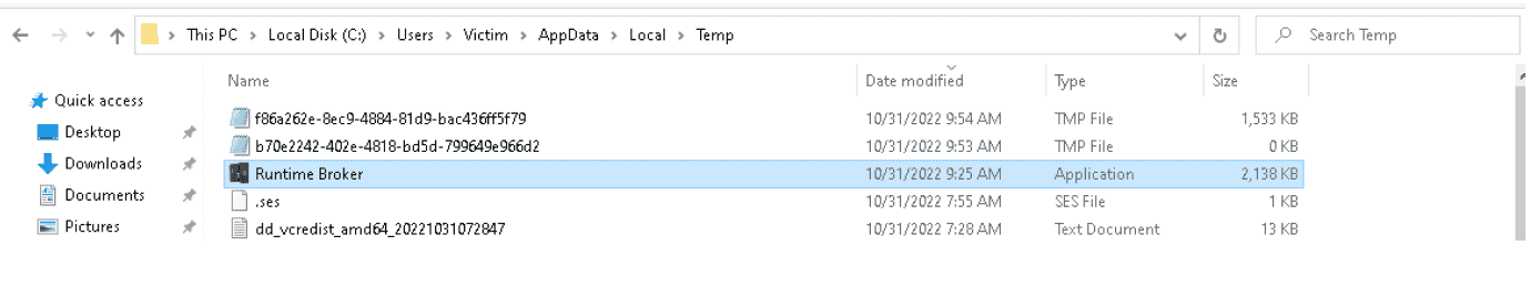 The resulting connections download and execute an executable called “Runtime Broker.exe” in the following path: C:\Users\Victim\AppData\Local\Temp