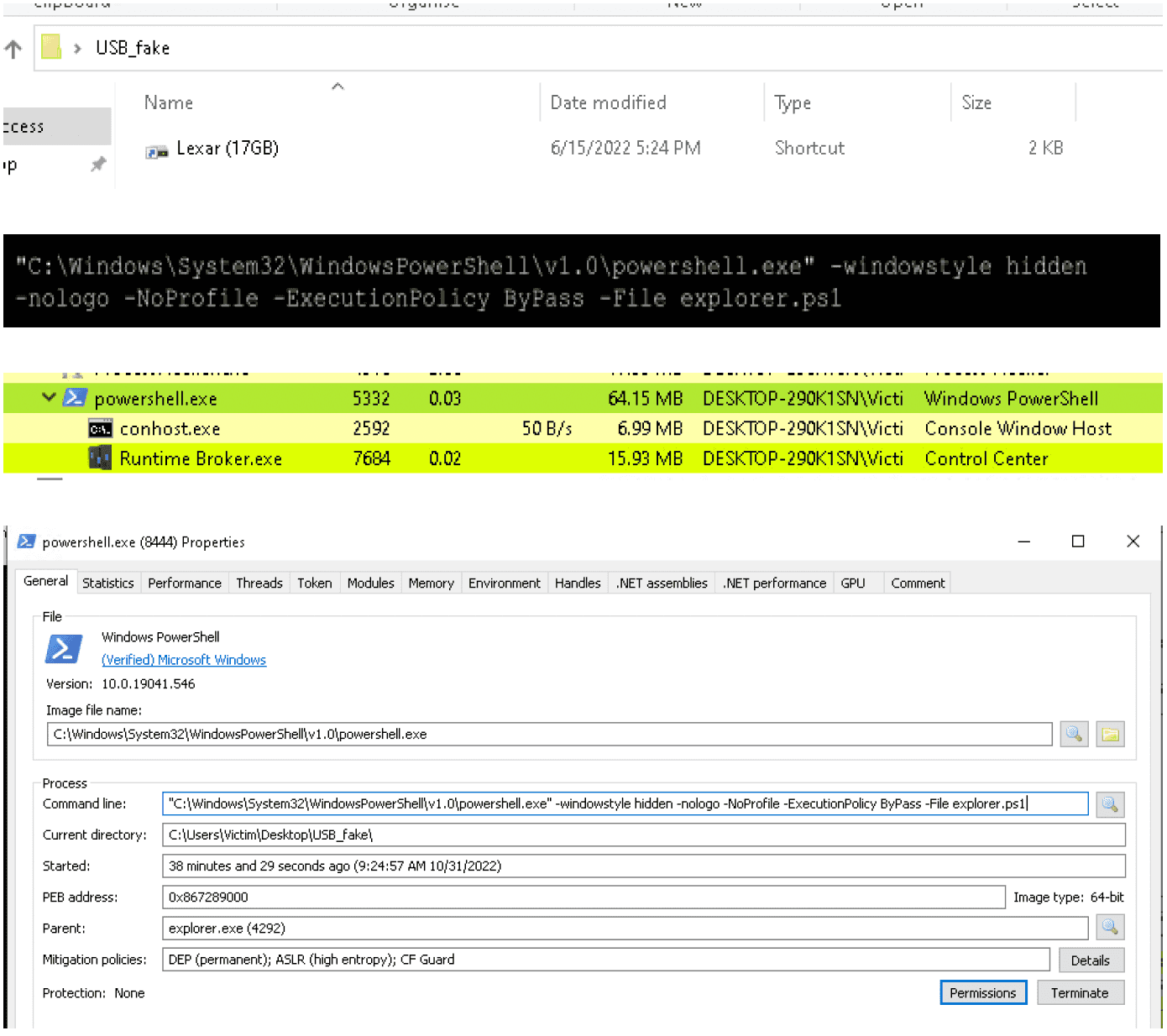 This document contains the analysis about a Windows binary file found on several customers during the last year and from the PanOptikon platform. The alerts were about suspicious traffic generated from the machine after the users inserted and opened the USB key. First analysis revealed that the usb icon is a fake image. In reality, it is a .lnk file (used in Windows as a shortcut used to open another file, folder, orapplication) containing a PowerShell string: