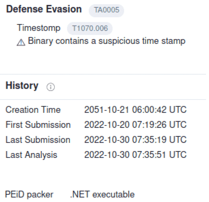 Starting from the VirusTotal analysis, two very suspicious points were observed: the first one is that the Creation date is in the future, and the second one is that the binary is packed using .NET 4.0 framework.