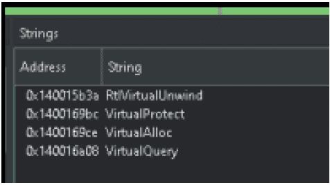 There are also some strings that refer to the Windows API calls used in common code injection techniques:
