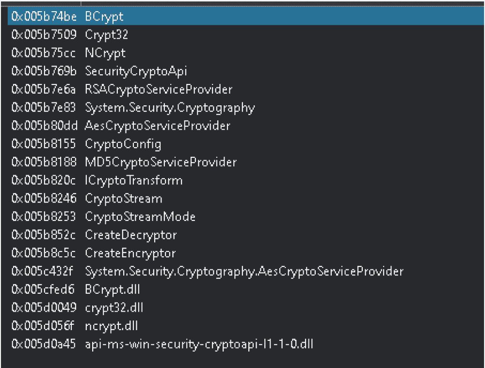 The strings contained in the binary could be related to ransomware behavior: there are some Windows API calls to cryptographic DLLs and also some calls to custom functions names, like CreateEncryptor and CreateDecryptor.