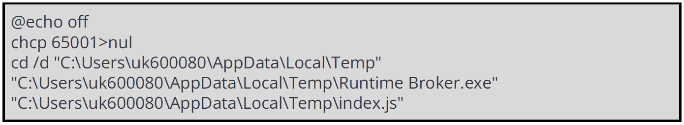 Then the process RunTime Broker.exe spawns a JS file named index.js (the file is located in the AppData\Local\Temp directory).